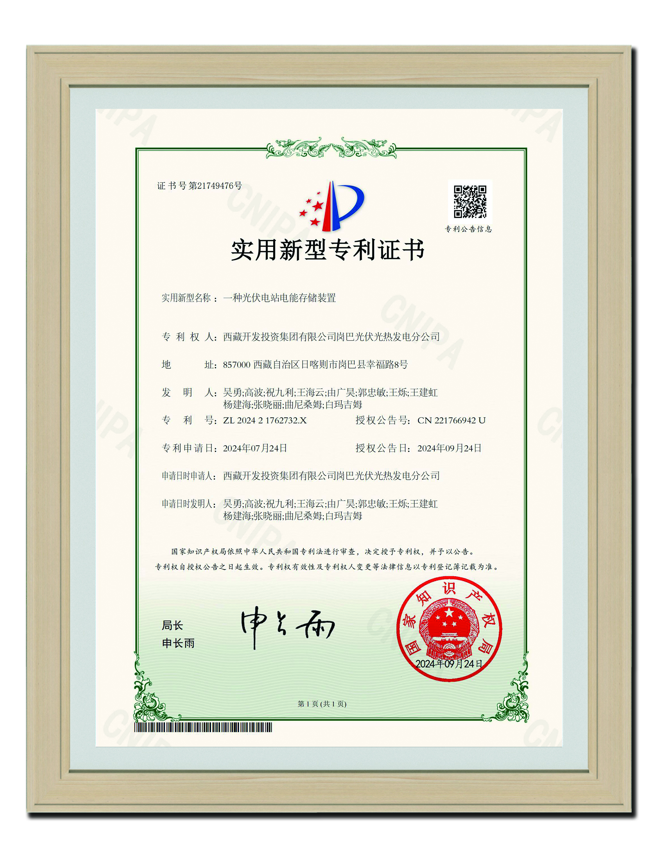 2024-09-24 實(shí)用新型專利證書(shū)_一種光伏電站電能存儲(chǔ)裝置