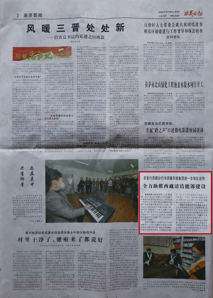 ?。ň幷甙矗段鞑厝請蟆?022年5月26日在第2版“高原要聞”欄目刊登文章,報道集團公司與農(nóng)發(fā)行西藏分行銀企攜手全力助推西藏清潔能源建設(shè)。全文如下:
