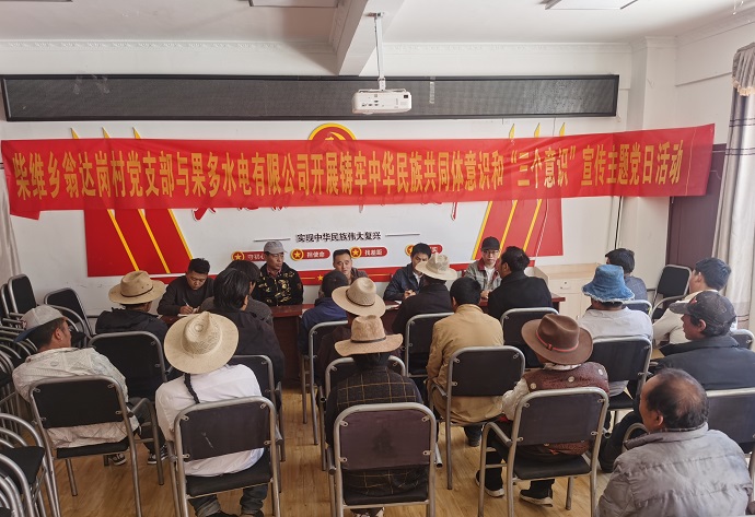 6月25日,果多水電公司黨支部結(jié)合習(xí)近平新時代中國特色社會主義思想主題教育活動與柴維鄉(xiāng)翁達崗村黨支部聯(lián)合開展了以“鑄牢中華民族共同體意識和‘三個意識’”為主題的黨日活動。