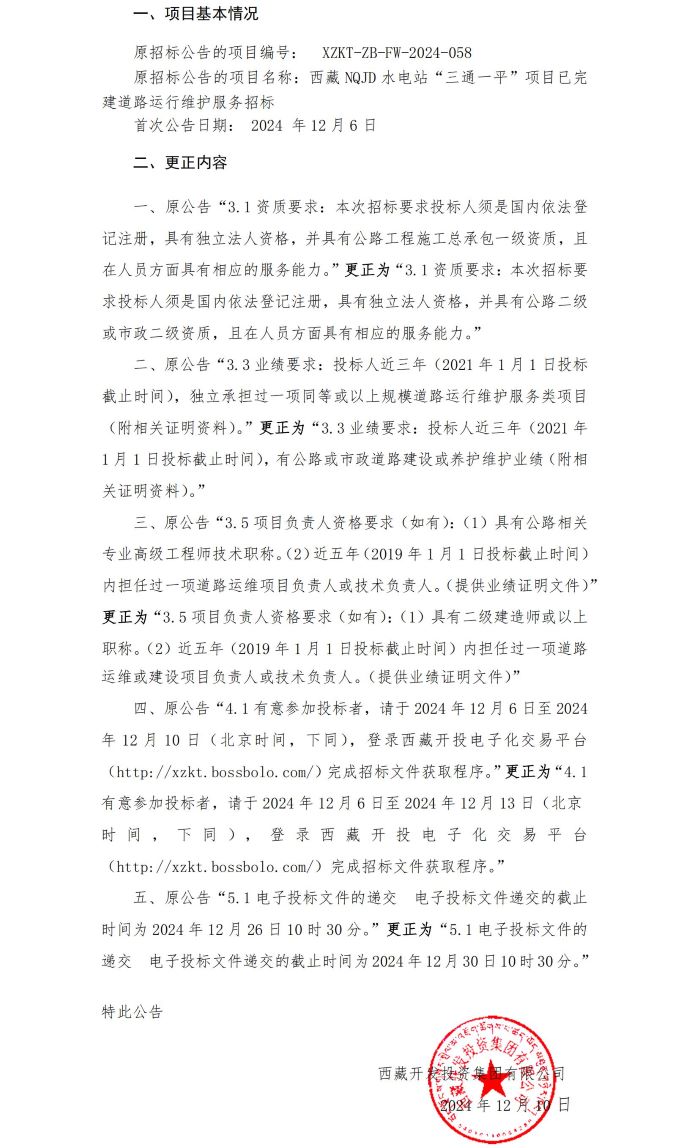 關(guān)于《西藏NQJD水電站“三通一平”項(xiàng)目已完建道路運(yùn)行維護(hù)服務(wù)招標(biāo)》的更正公告