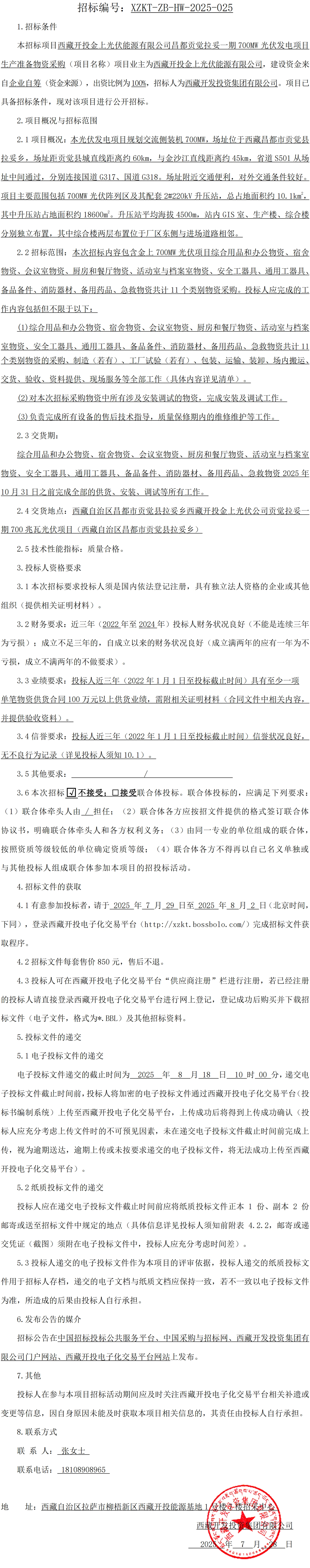 西藏開投金上光伏能源有限公司昌都貢覺拉妥一期700MW光伏發(fā)電項(xiàng)目生產(chǎn)準(zhǔn)備物資采購(gòu)招標(biāo)公告
