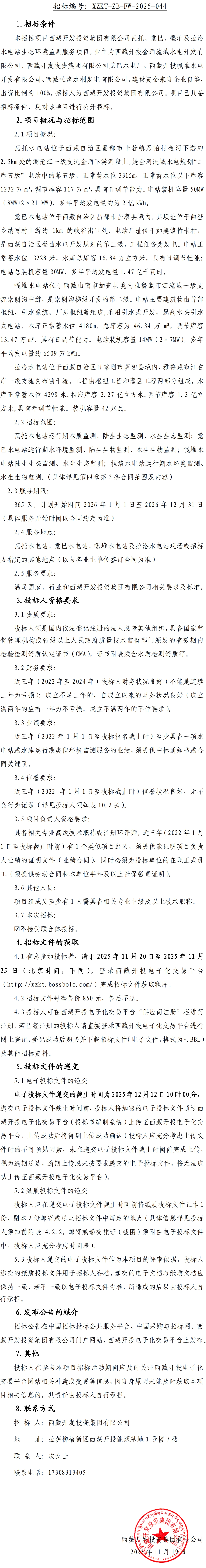 西藏開發(fā)投資集團有限公司瓦托、覺巴、嘎堆及拉洛水電站生態(tài)環(huán)境監(jiān)測服務招標公告