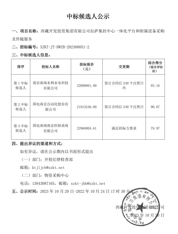 中標(biāo)候選人公示(集控中心一體化平臺(二次)